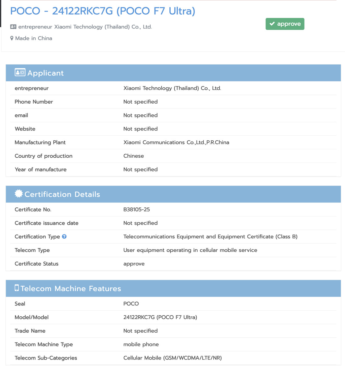 Smartfón POCO F7 Ultra sa objavil v thajskej certifikácii NBTC pod modelovým označením 24122RKC7G. Ten istý model sa ešte predtým objavil v databáze benchmarkovej aplikácie Geekbench, ktorá odhalila prítomnosť čipsetu Qualcomm Snapdragon 8 Elite.