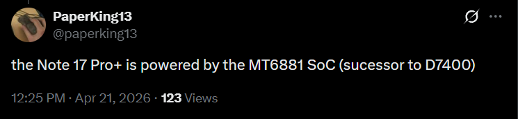 Redmi Note 17 Pro+ Global: 9210mAh + 100W pic.twitter.com/JO7gmC6tGO— PaperKing13 (@paperking13) April 21, 2026